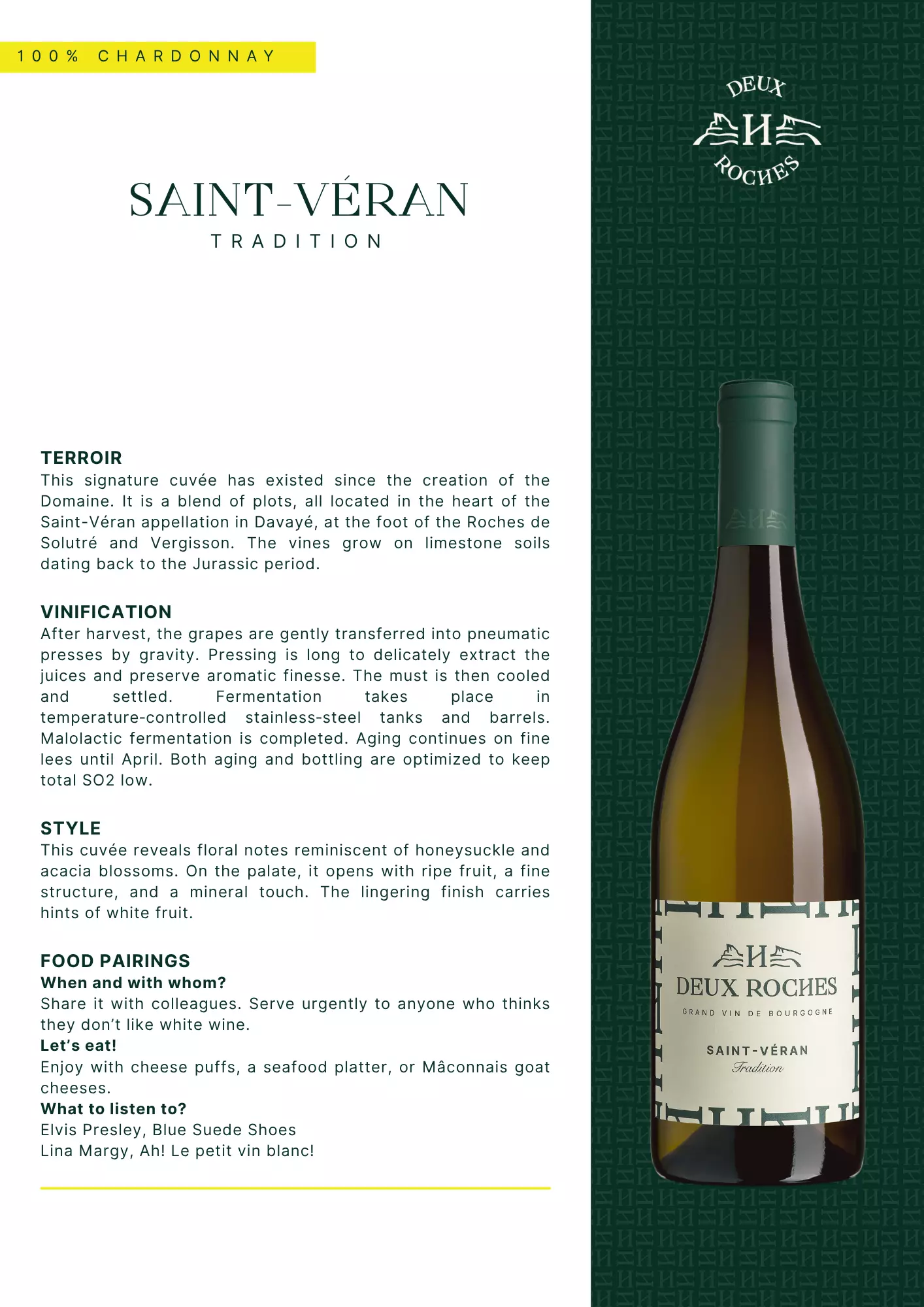 This cuvée is a selection of plots located in the heart of the Saint-Véran appellation, around Davayé, near the Roches de Solutré and Vergisson. These chalky soils dating back to the Jurassic period are perfect for bringing out the best in Chardonnay. A rich and ripe Saint-Véran, full of liveliness. Its great character and beautiful typicity are unanimously appreciated. It was the first wine produced at Les Deux Roches in 1983.